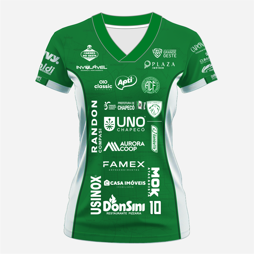 Pensando no orgulho de representar Chapecó para todo o Brasil, a camisa traz um detalhe exclusivo com o mapa da cidade em seu fundo, reforçando ainda mais a identidade local, e palavras que fazem parte do legado da Chape Futsal. A gola em V adiciona um toque de sofisticação, enquanto o escudo em patch valoriza o acabamento e honra o legado do clube.